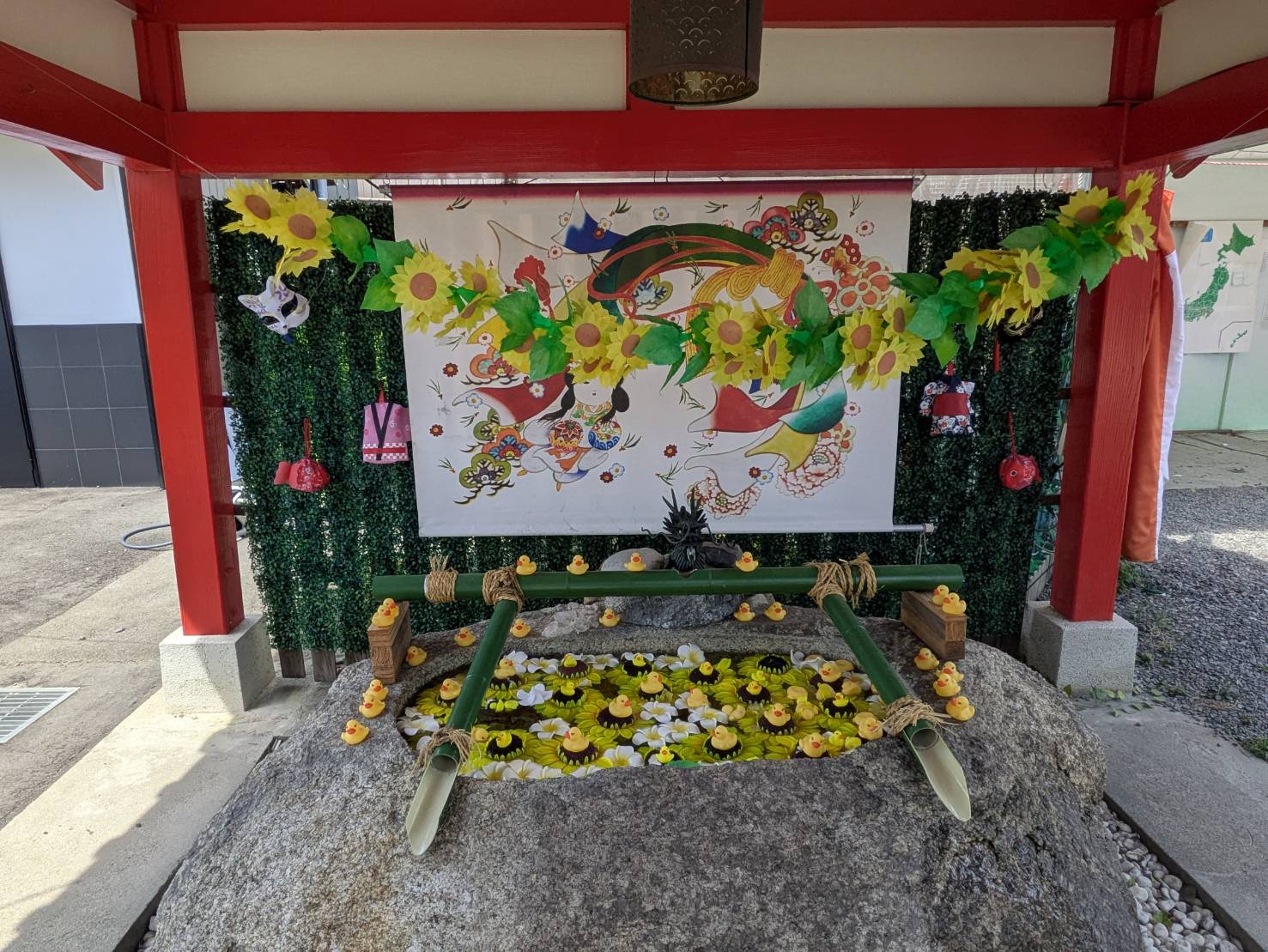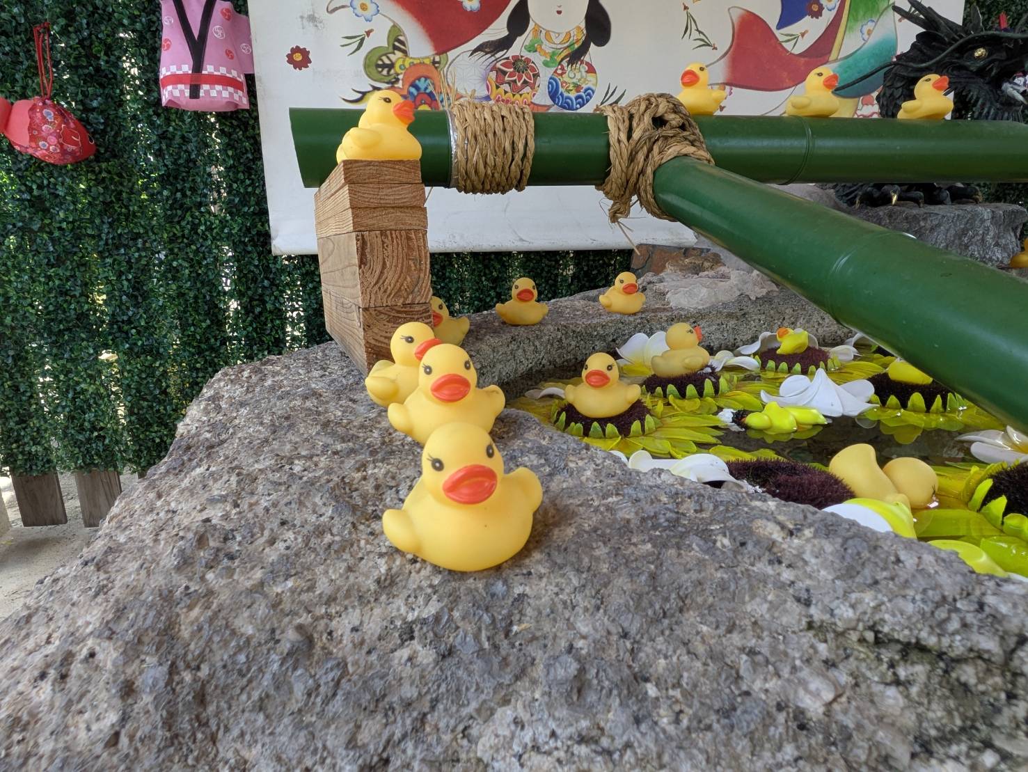 手水鉢にはアヒルちゃんの大群が!