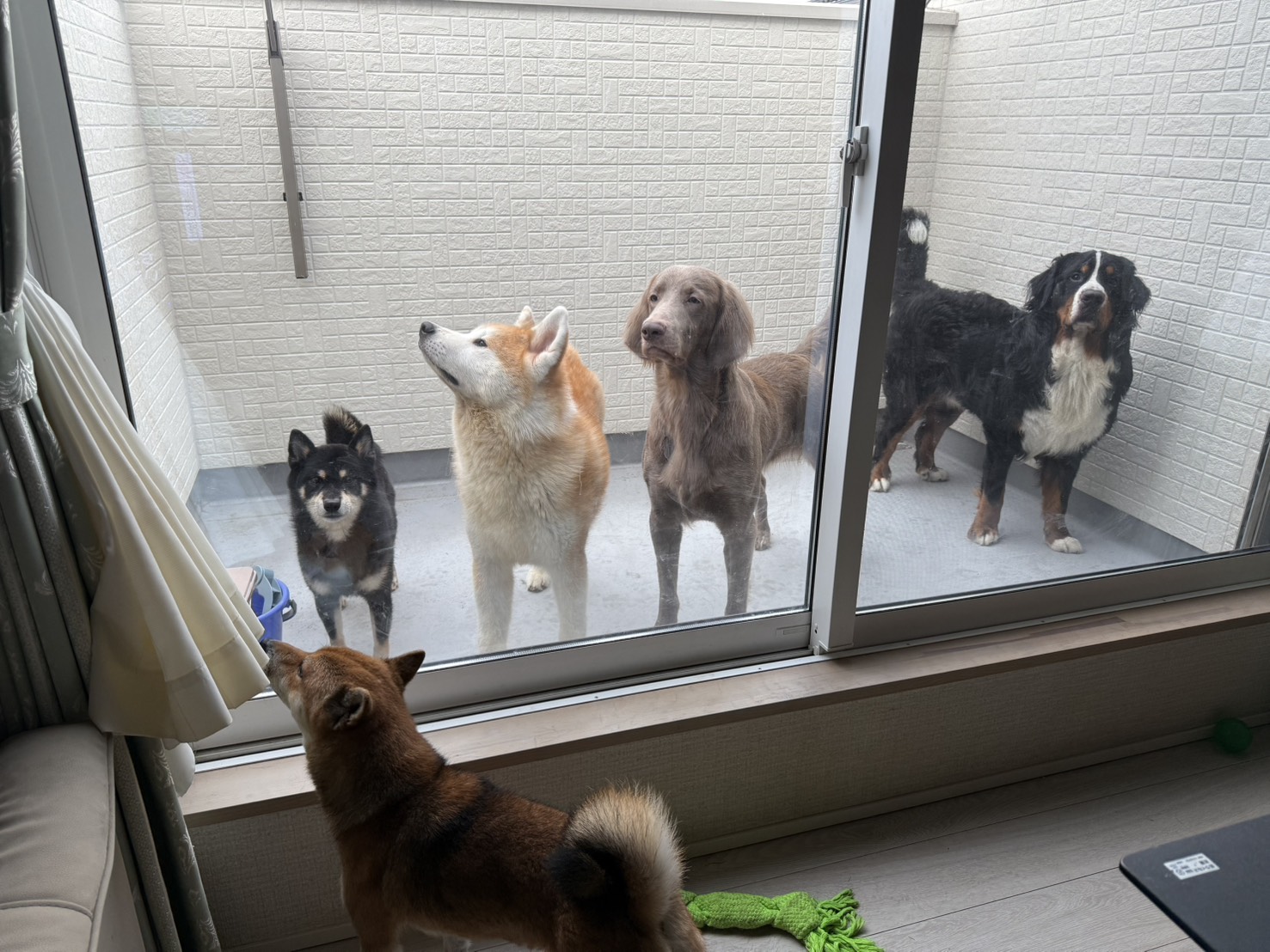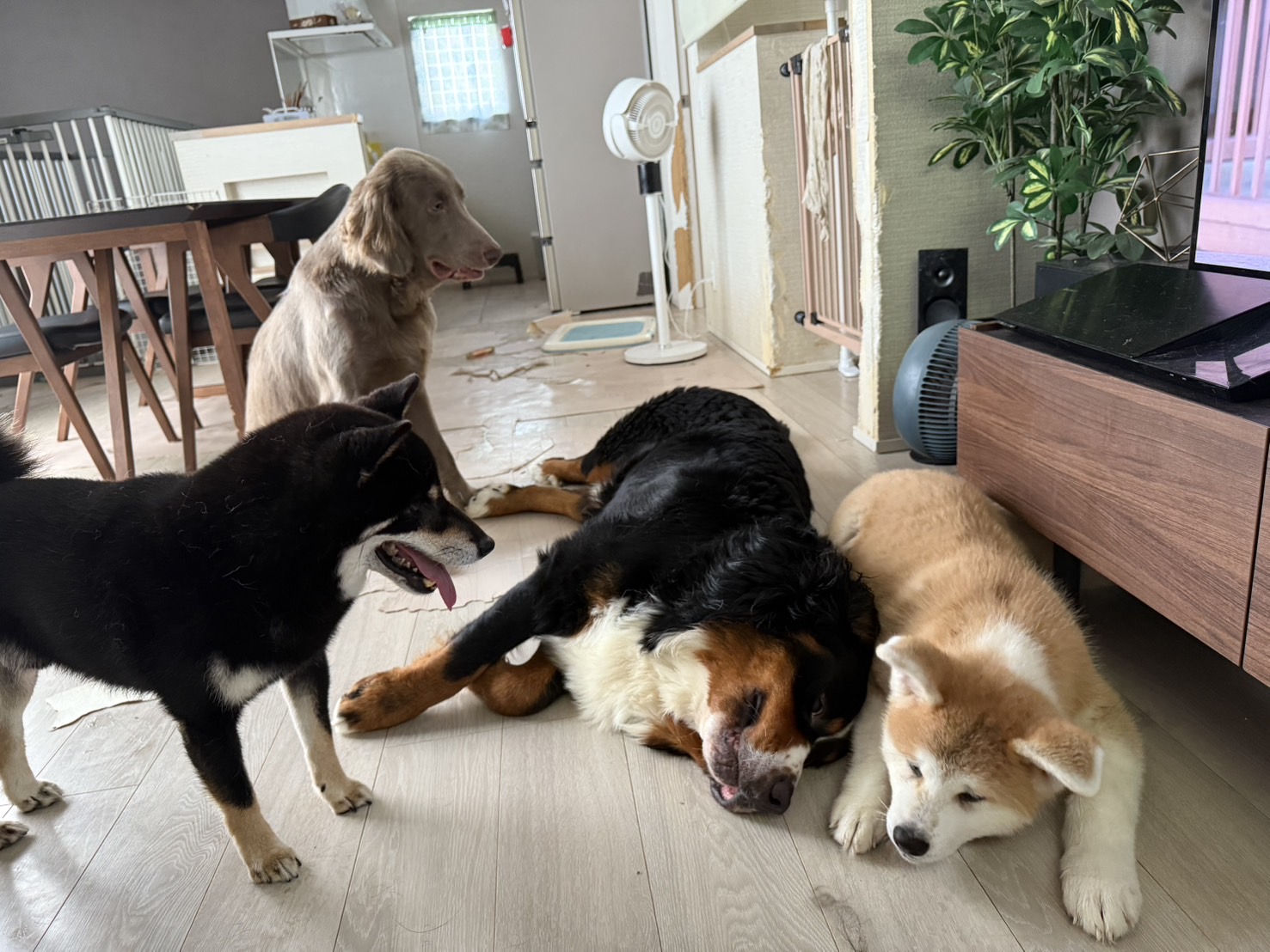 またここのところの猛暑でわんこ達もストレス溜まっているのかごはん戦争にリーダー抗争など争いも多いのですが下の写真のようにみんな仲良くしている姿を見るとホッとして自分の中での一番の癒しです♪