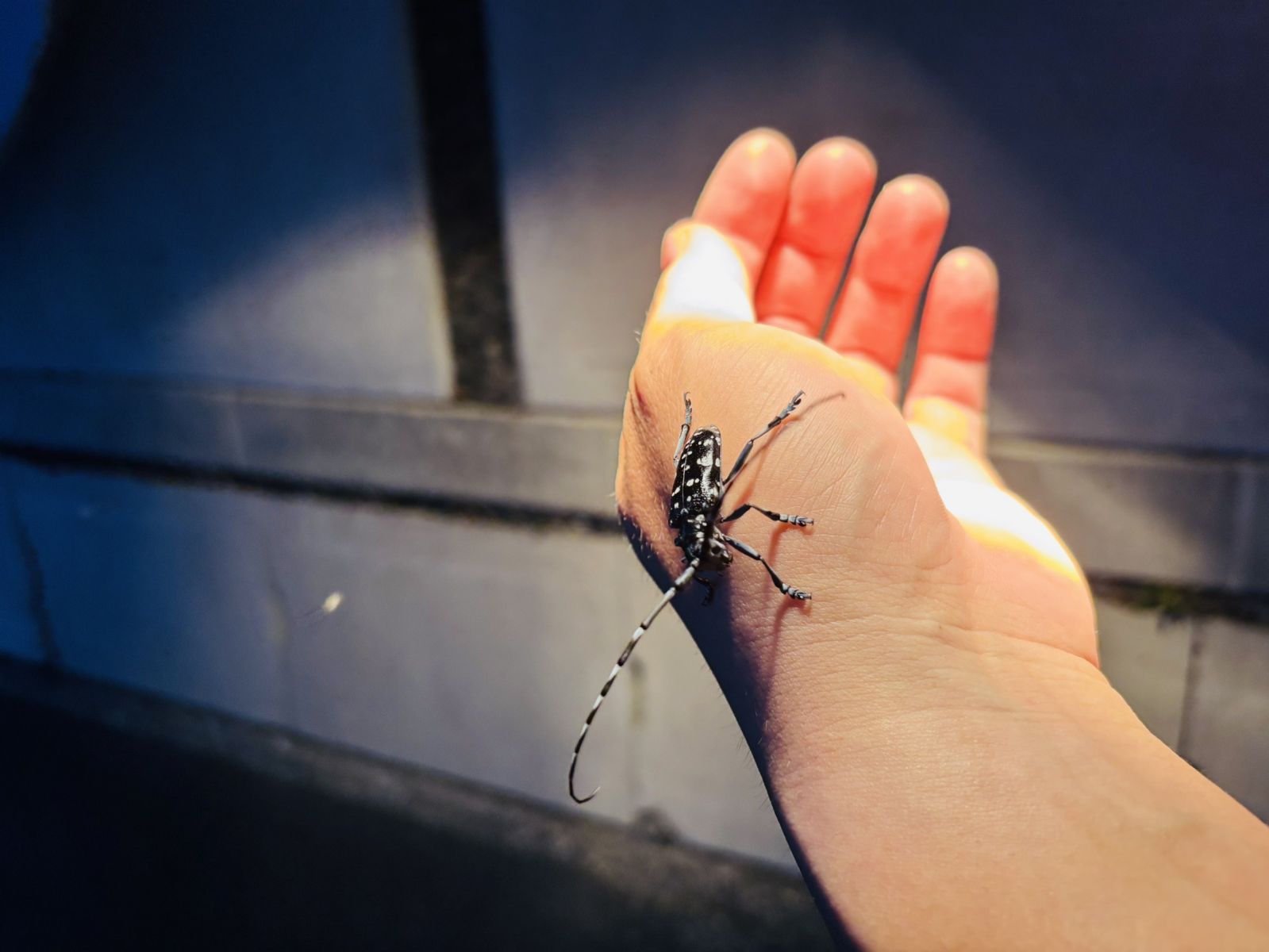 先日、自宅前の玄関先で、可愛い白い水玉模様がトレードマークの「ゴマダラカミキリ」に遭遇。